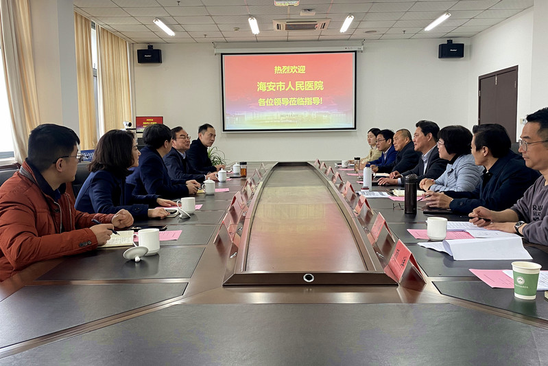 3月21日上午,海安市人民医院党委书记吕书军、党委副书记、院长吉华亮等一行来8455新葡萄场网站开展工作交流。