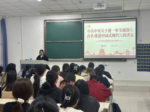 11月14日晚,人文学部领航学社在JX5-6-109教室集中学习《中共中央关于进一步全面深化改革推进中国式现代化的决定》。此次活动由副社长朱紫轩主持,学社成员们积极参与。