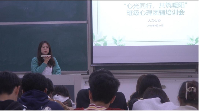为助力班级心理骨干高效组织班级心理团辅活动,2025年4月21日晚,人文学部心理协会于教学楼3-4-102开展“心光同行,共筑暖阳”班级心理团辅培训活动,大一全体心理委员和班长参加培训,人文学部党总支副书记许静静老师到会场查看培训情况。